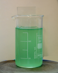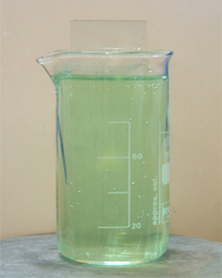 The substrate is previously cleaned with liquid detergent and alcohol, and than is immersed in the beaker that plays a role of a chemical bath with deposition solution. The substrate is vertically supported against the walls. The obtained system is then placed on heating plate, heated and stirred slowly, up to 95 ºC with continuously stirring. In the begging the solution is bright green Fig.1 and later it gets darker Fig. 2. The achieved temperature is kept constant during the deposition. The deposition time varied depending on the desired film thickness. For the purpose of this experiment the deposition should be terminated after approximately 25 to 30 min (10-15 min after the reaching temperature of 95˚C).