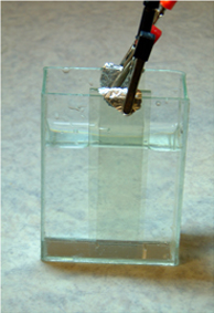 - Immerse the clean substrate facing the wall of the beaker with non conductive side (check with ohmmeter) and put small piece of aluminum foil on the contact with the crocodile clip and connect the wire to the power source of direct current.