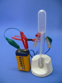 • Pokrenite elektrolizu spajanjem elektroda (igala) s baterijom s krokodil-štipaljkama.