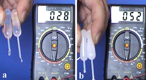 | Beobachtung und Diskussion Lösungen können unterschiedliche Mengen gelöster Stoffe enthalten. Abhängig davon lassen sich drei Fälle unterscheiden: a) Eine ungesättigte Lösung enthält weniger gelösten Stoff als bei einer bestimmten Temperatur möglich ist. Fügt man noch mehr von diesem Stoff zu, dann löst er sich auch noch. b) Eine gesättigte Lösung enthält gerade so viel gelösten Stoff wie bei einer bestimmten Temperatur möglich ist. Fügt man einer gesättigten Lösung noch mehr von diesem Stoff zu, dann löst er sich nicht mehr. c) Eine übersättigte Lösung enthält mehr gelösten Stoff als eine gesättigte Lösung. Fügt man einer übersättigten Lösung noch mehr von diesem Stoff zu, dann bewirkt das Kristallisation. Übersättigte Lösungen sind nicht stabil. Sie können leicht durch mechanischen Stress oder durch Zugabe von „Impf-Kristallen“ gestört werden. Im vorliegenden Experiment geschieht dies durch den Kontakt der Lösung mit dem Metall der Schere (Schneiden oder Stechen mit einer Nadel). Im Unterschied zu diesem wohlbekannten Experiment ist die vorgestellte Form als Schüler-Experiment möglich. Sie spart Zeit, indem man die Lösungen in den verschweißten Pipetten vorbereiten kann. Die Lernenden fassen dabei die Pipette an, fühlen die freigesetzte Wärme und die Volumenkontraktion. Das ermöglicht Schlüsse und motiviert dazu, über die Ursachen, nämlich die dichtere Packung von Molekülen und Ionen nachzudenken. Unter Verwendung von zwei Pipetten und eines digitalen Thermometers lässt sich der Temperaturanstieg messen.
